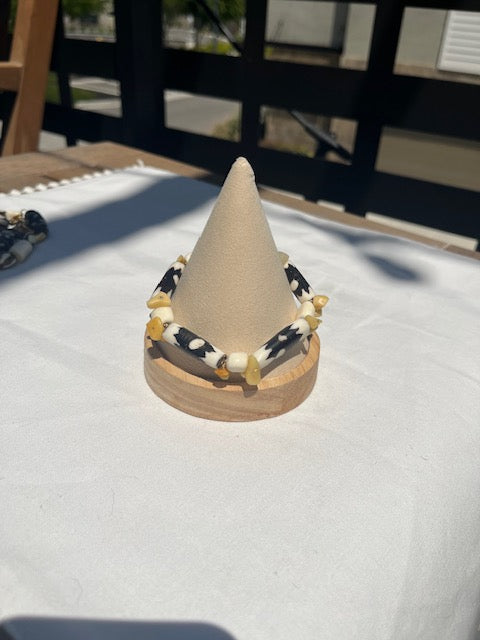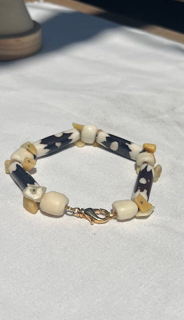Carved Batik tubes and bone with bright yellow quartz on gold chain with lobster claw closure