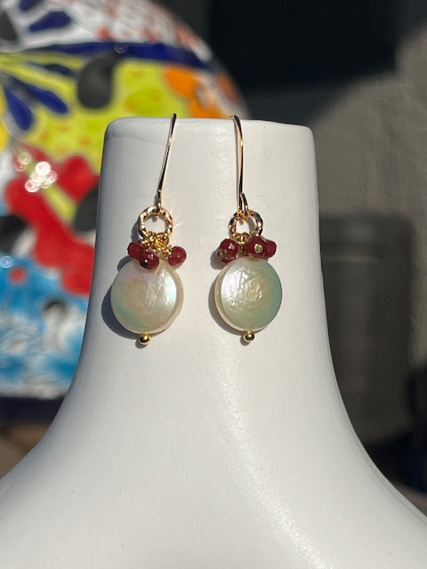 Smooth mother of pearl coins with your choice of lapis or garnet, and gold ear hooks