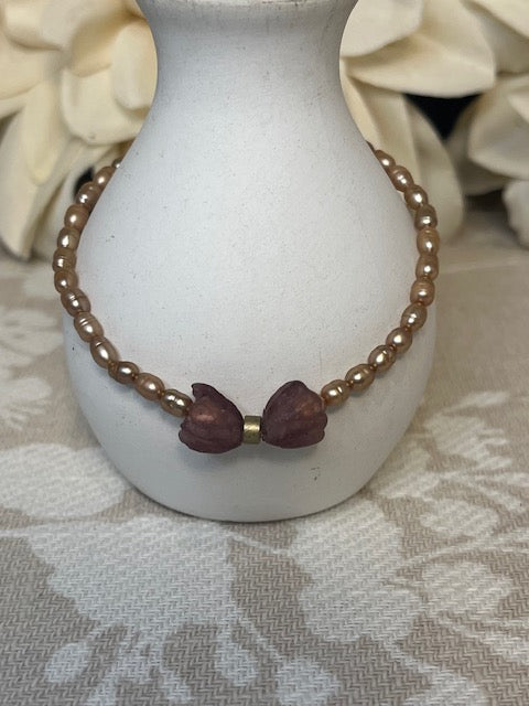 Mauve freshwater rice pearls with plum Ghanian recycled sea glass beads on elastic cord