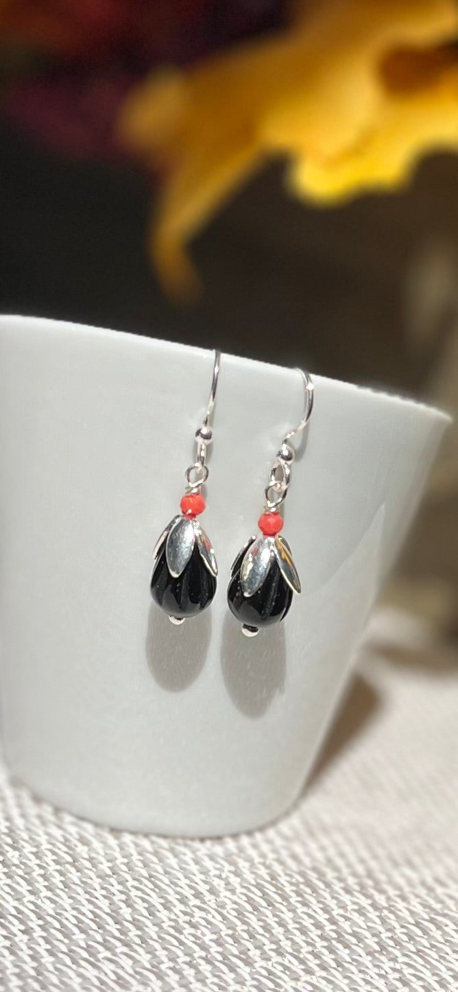 Sculpted onyx with your choice of garnet, turquoise, coral, hessonite gemstones, in either silver or gold accents and ear hooks
