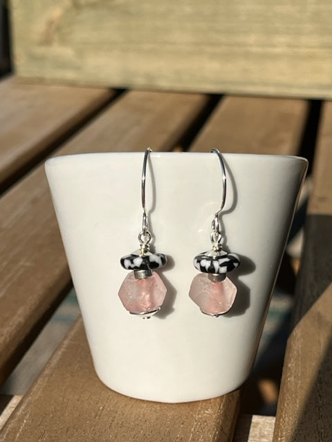 Pink faceted java sea glass and fused recycled glass beads on silver-plated ear hooks