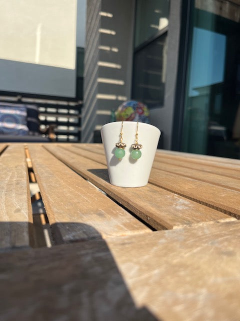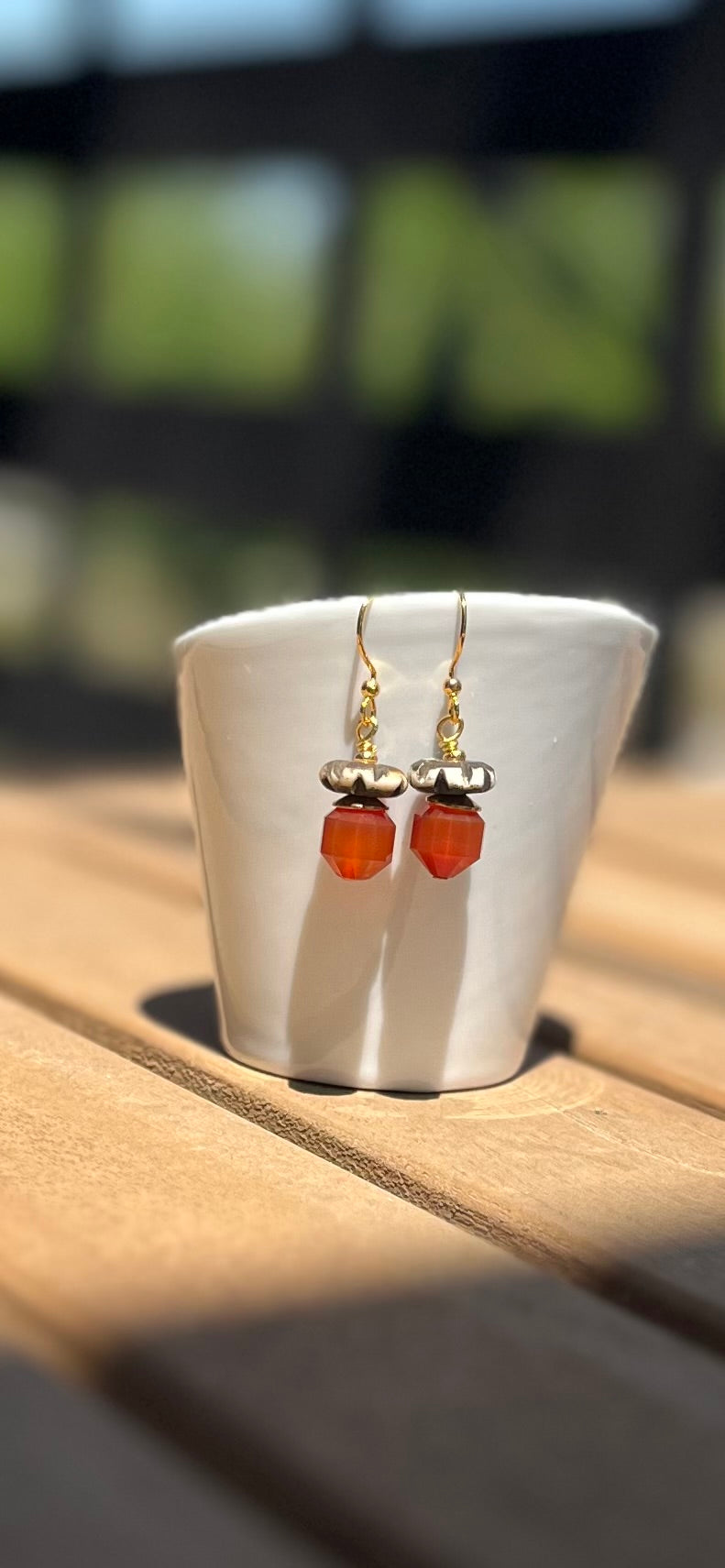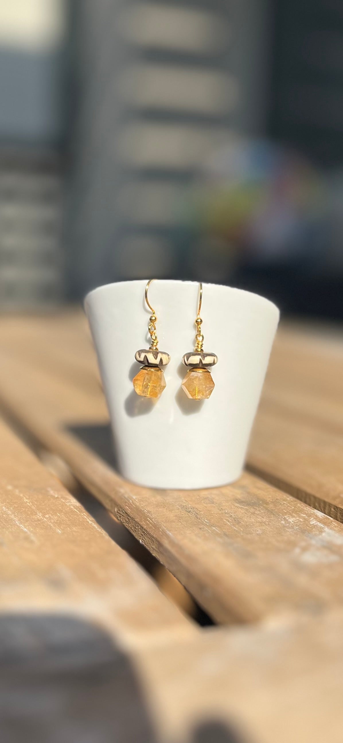 faceted citrine, carnelian, or aventurine with carved batik and gold ear hooks.