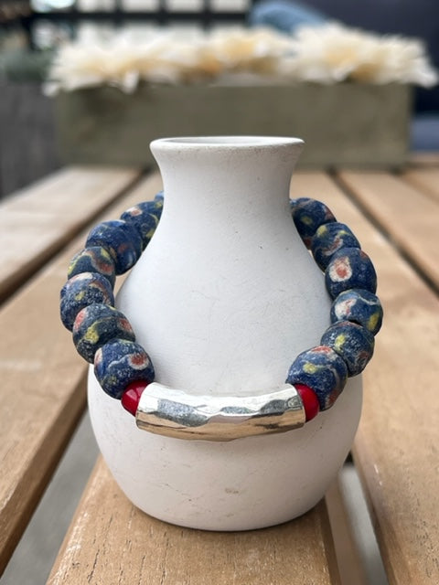 Vintage African blue sandcast and white hear beads on silver-plated ear hooks. Tema Bracelet sold separately.