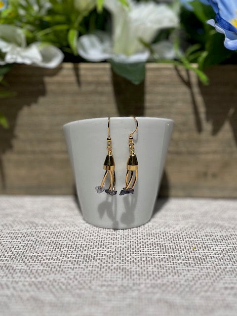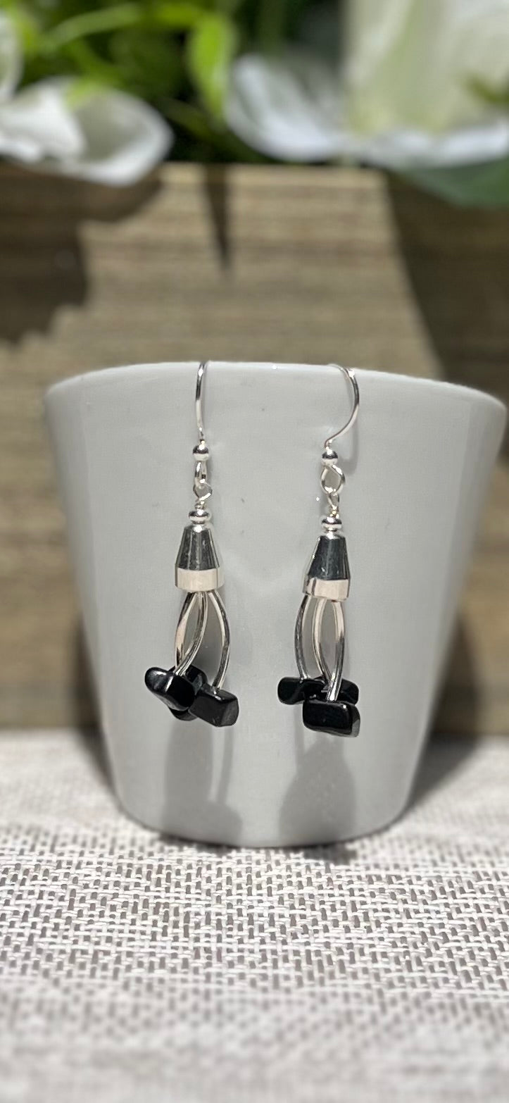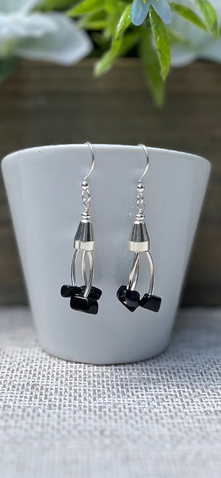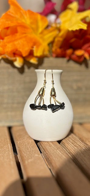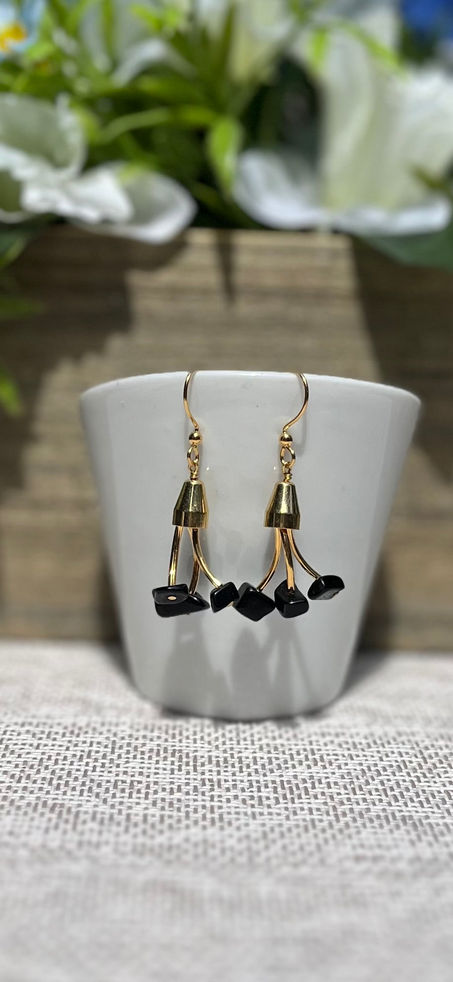 Whimsical tripod earrings with your choice of silver or gold, and onyx, coral, hematite chips
