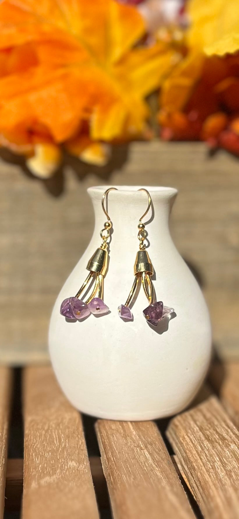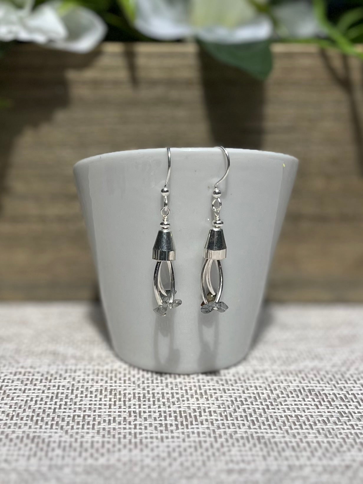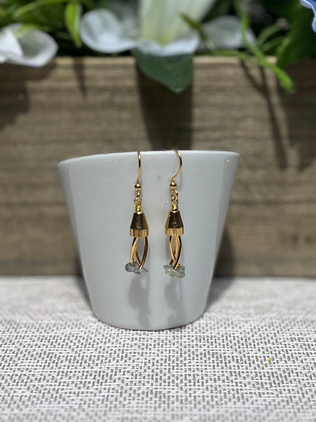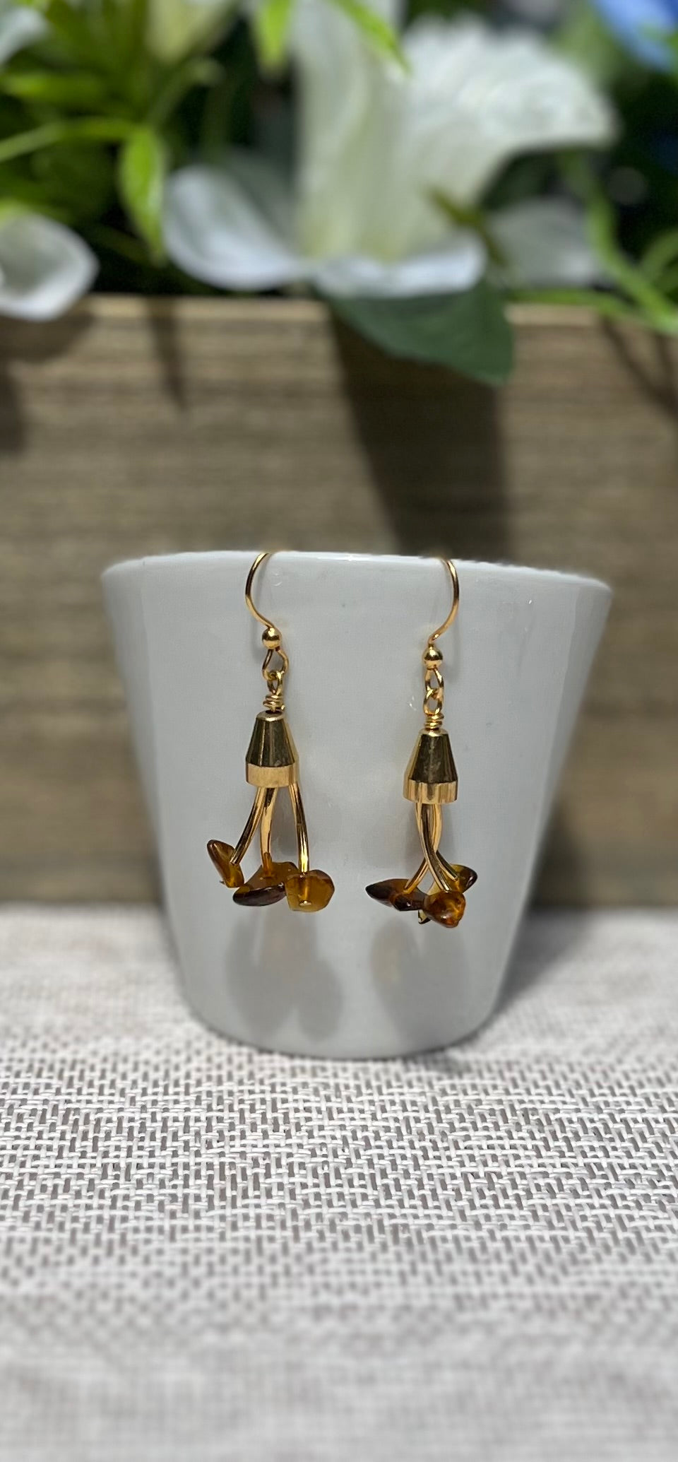 Whimsical tripod earrings with your choice of silver or gold, and onyx, coral, hematite chips