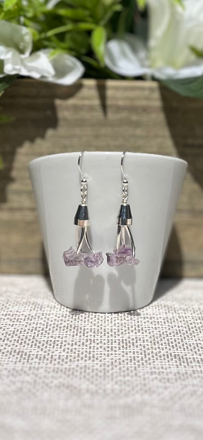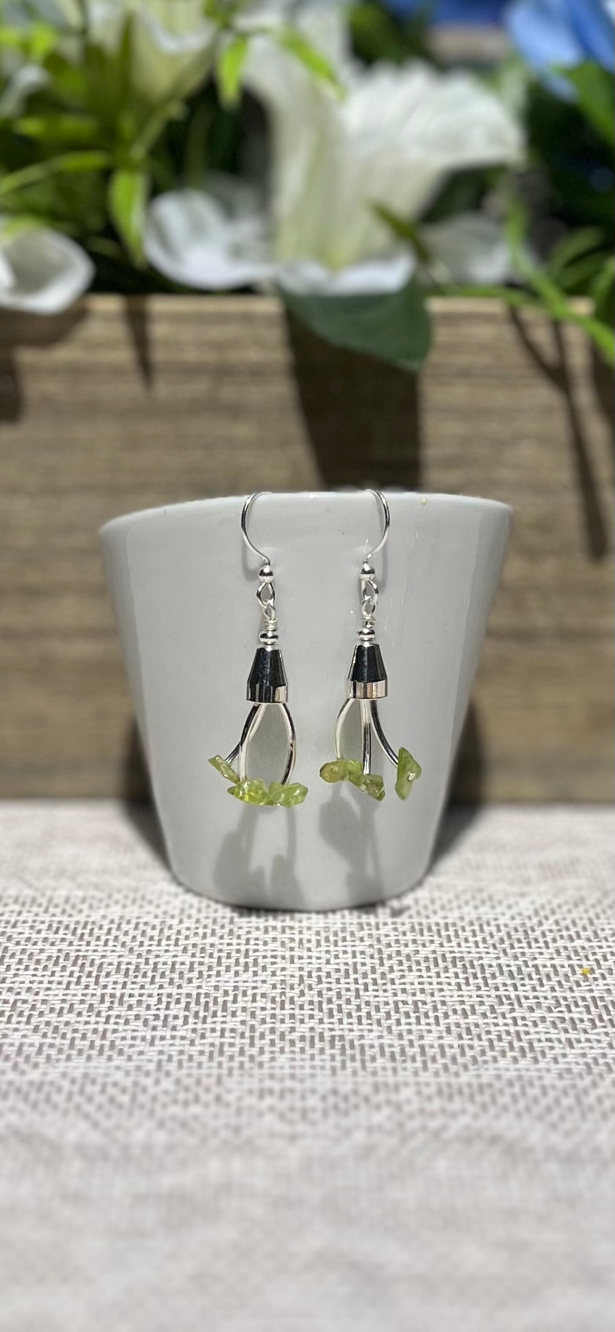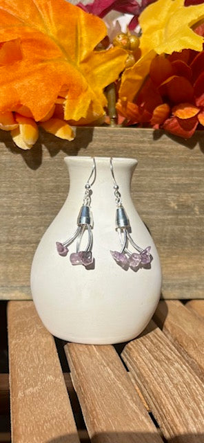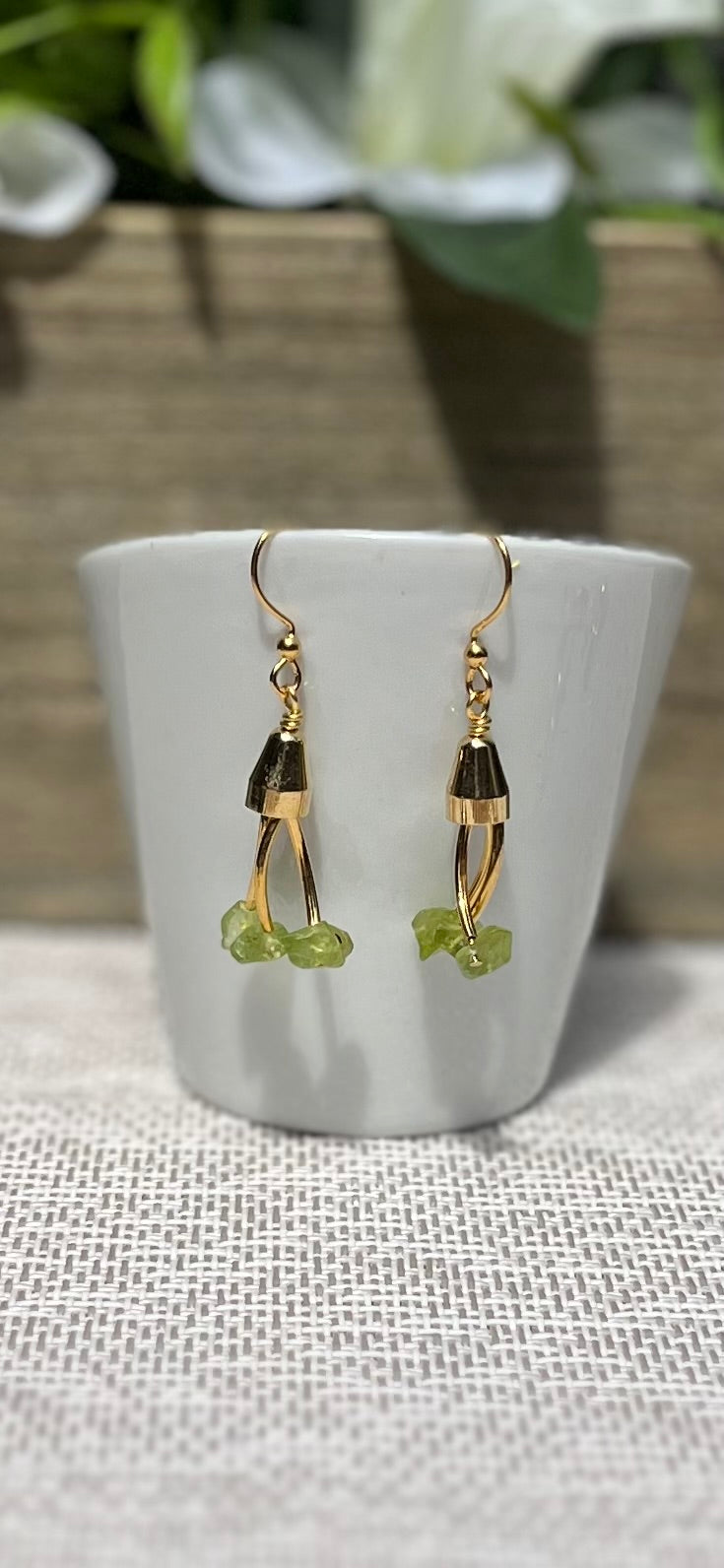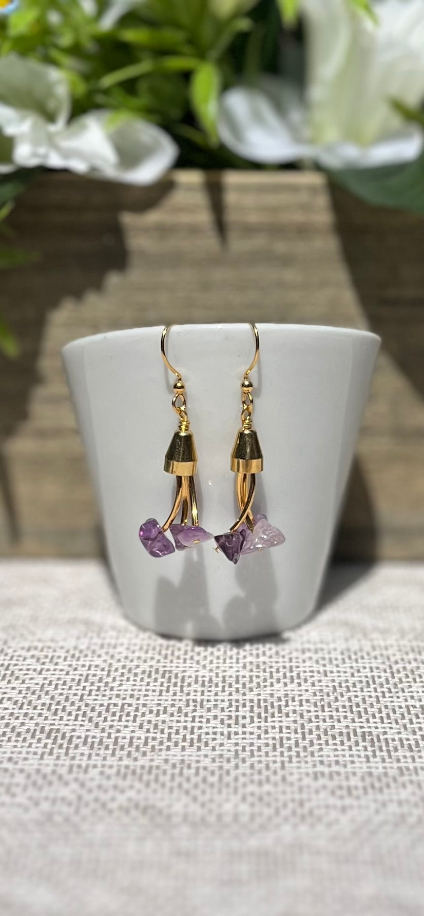 Whimsical tripod earrings with your choice of silver or gold, and onyx, coral, hematite chips